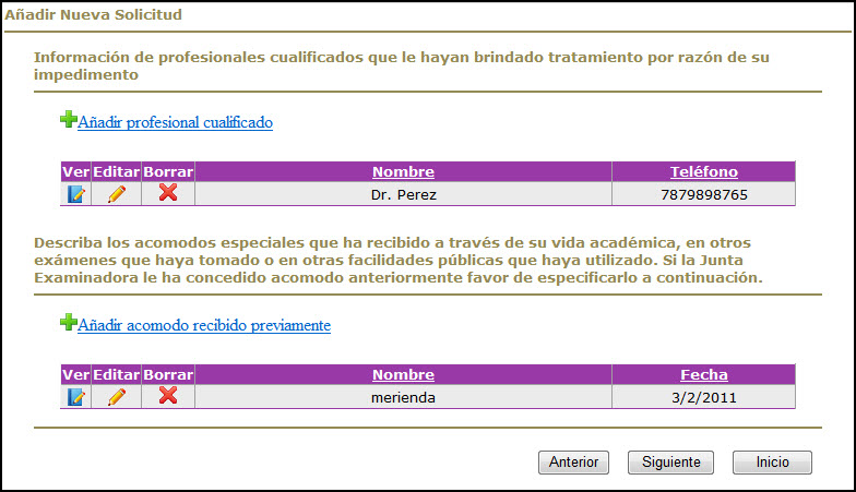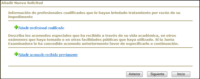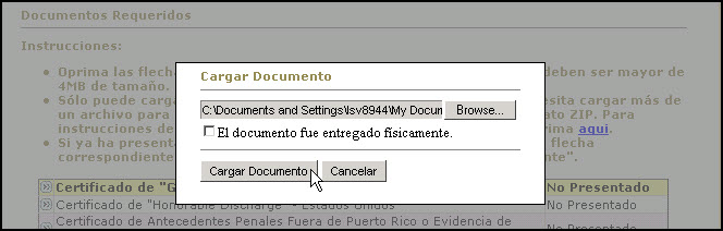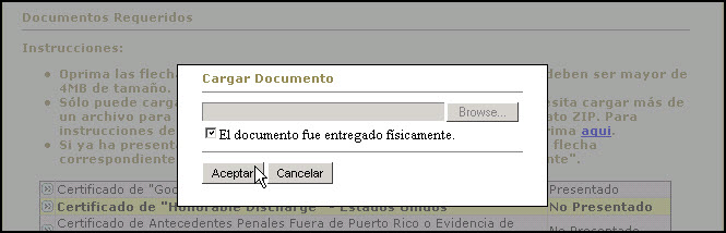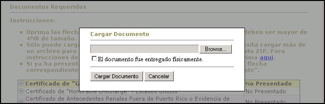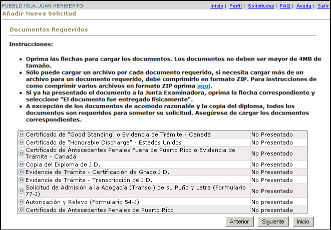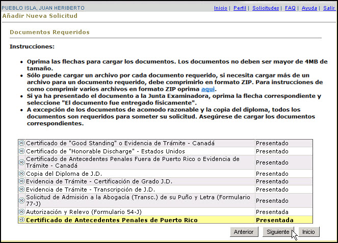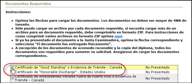 El Sistema provee al usuario(a) la capacidad para cargar un archivo con la información requerida para cumplir con un requerimiento de la Junta Examinadora, como por ejemplo el Certificado de Antecedentes Penales de Puerto Rico o la Certificación del Cuerpo Militar.
