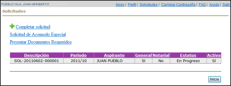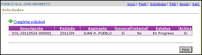 Se recibirá la página de Solicitudes del usuario(a), en la cual se seleccionará la solicitud por someter y se presionará el enlace de "Completar solicitud":
