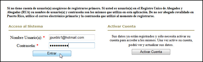 Esta función permite activar una cuenta previamente creada por la Junta Examinadora. Cuando reciba la comunicación de la Junta Examinadora siga el siguiente procedimiento: