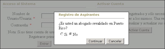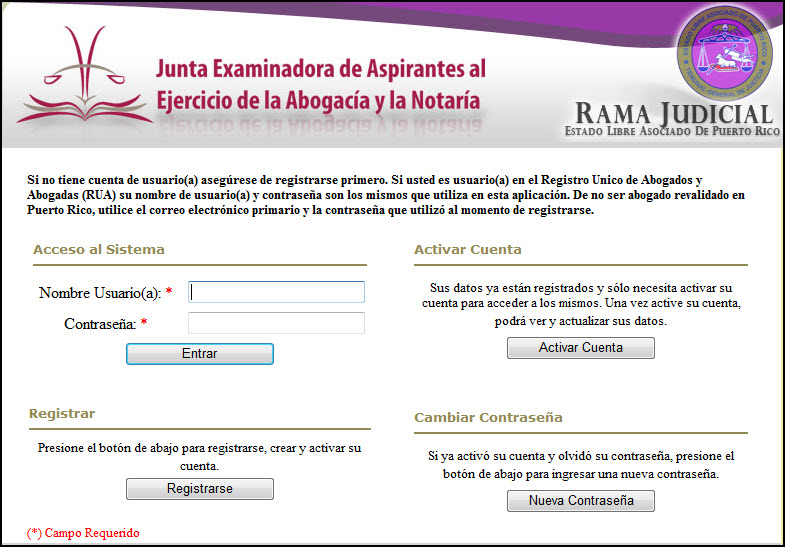 Al acceder al Portal de la Junta Examinadora de Aspirantes al Ejercicio de la Abogacía y la Notaría se recibirá la página 'web' de entrada al sistema, la cual ofrece al usuario(a) los puntos de ingreso para registrarse, activar su cuenta, cambiar su contraseña y utilizar el sistema para hacer solicitudes de exámenes de reválida o dar mantenimiento a la información en su perfil: