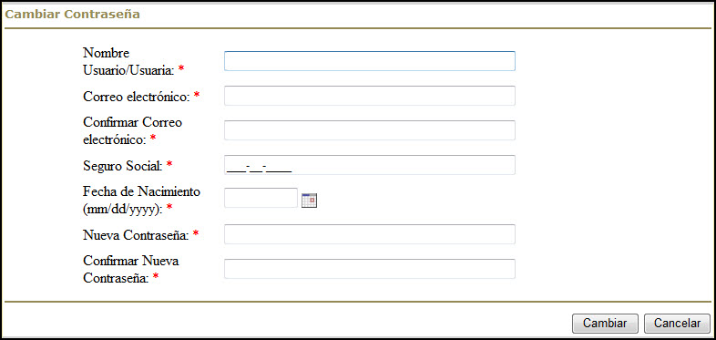 Complete todos los datos requeridos en la página de Cambiar Contraseña: