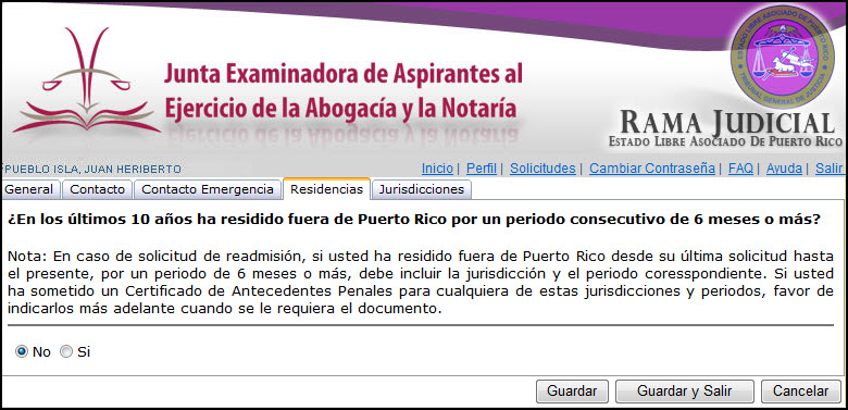 Esta sección permite la entrada de la información sobre residencia del usuario(a) fuera de Puerto Rico por un periodo de seis (6) meses o más, en los últimos diez (10) años.