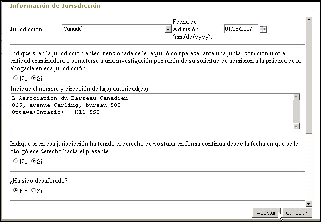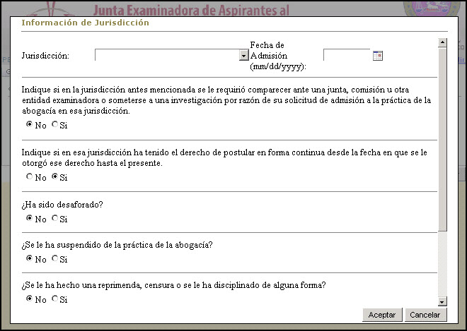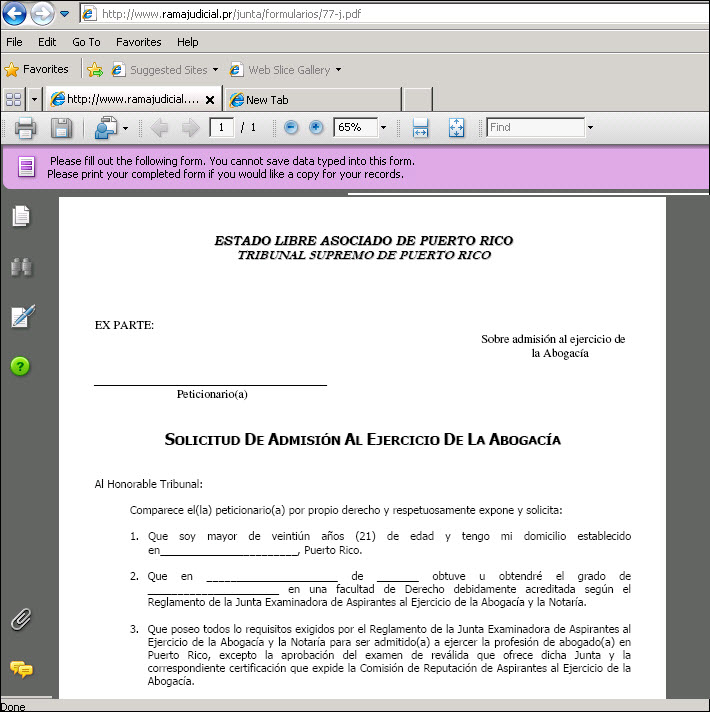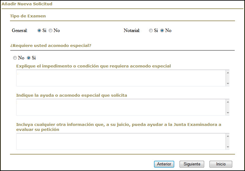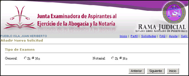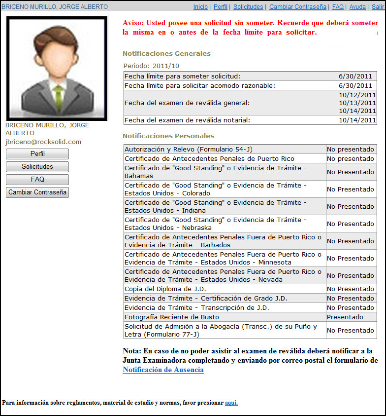 Una solicitud puede ser completada en varias sesiones, mientras se someta antes de la fecha límite para solicitar establecida por la Junta Examinadora de Aspirantes al Ejercicio de la Abogacía y la Notaría. Al volver a entrar a la aplicación 'web' e identificarse con su nombre y contraseña, el usuario(a) recibirá un aviso indicándole que tiene una solicitud comenzada pero no sometida: