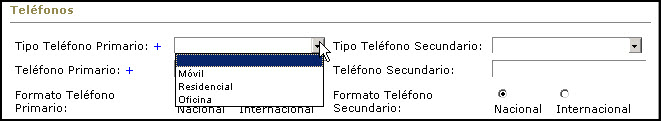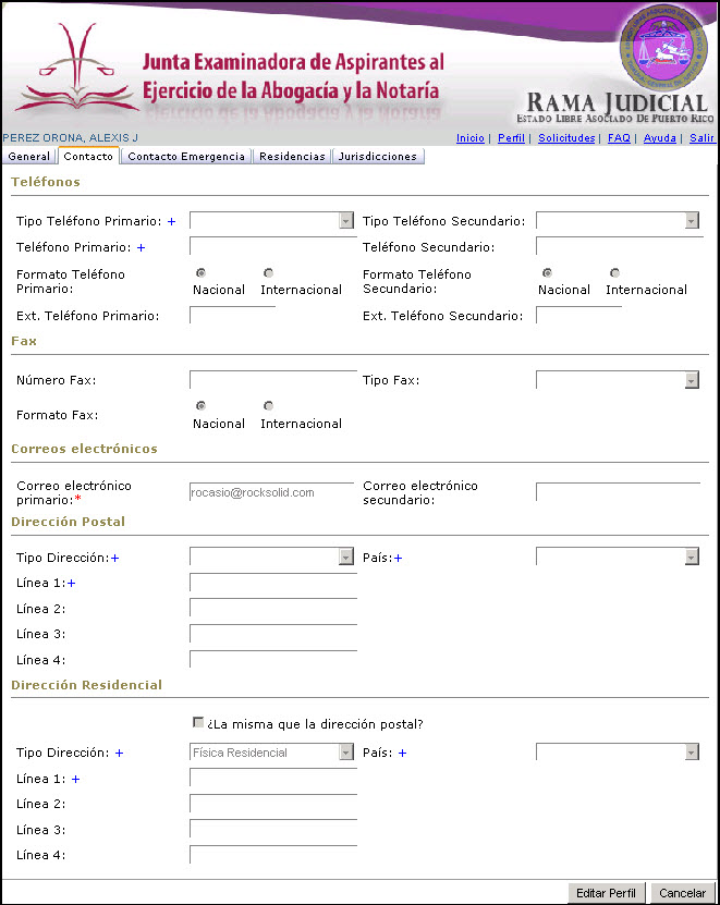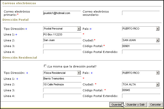 Esta sección del Perfil permite entrar la información de contacto del usuario(a) - teléfonos, fax, direcciones de correo electrónico, dirección residencial y dirección postal.