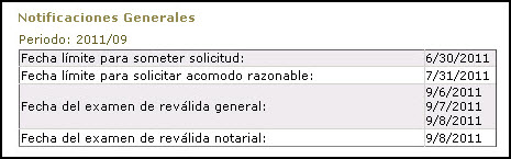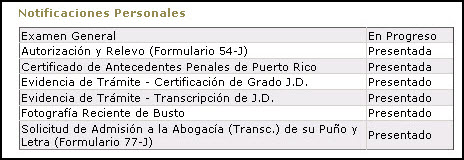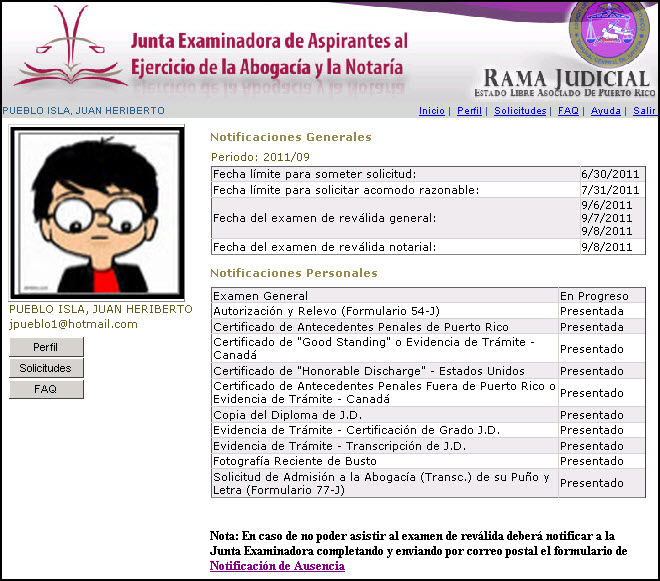 La página principal contiene ahora la lista de notificaciones personales generadas por el proceso de la solicitud de examen.