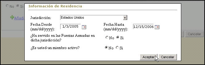 Al utilizarse el enlace de "Añadir nueva residencia" se presentará la página para entrar la Información de Residencia: