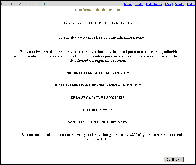 El Sistema le presentará la Confirmación de Recibo con las instrucciones para finalizar el proceso de la Solicitud:
