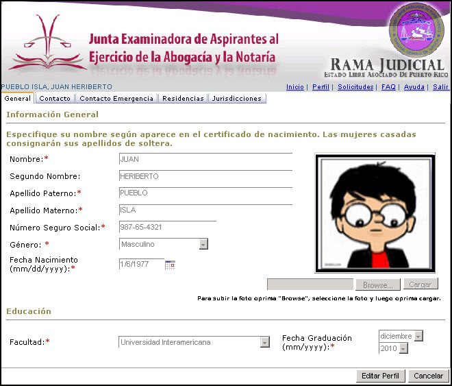 Además de la Información General, la página del Perfil contiene varias secciones presentadas en forma tabulada: