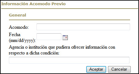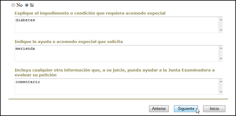 Al completar la página de Tipo de Examen y las de Acomodo Especial (si se requiere este último), se presentará la página con la lista de documentos que debe presentar el aspirante para el proceso de su solicitud, de acuerdo al tipo de examen solicitado y a sus datos personales: