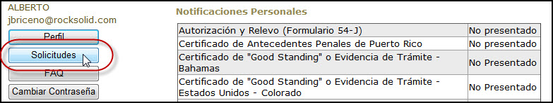 La página principal del usuario(a) presenta su nombre, fotografía y dirección de correo electrónico, e incluye además notificaciones generales y personales que atañen al Periodo Activo, así como los enlaces para el manejo de las Solicitudes, el mantenimiento del Perfil de Usuario(a), el regreso a la página de entrada, a la lista de preguntas frecuentes (FAQ), a la función de Ayuda al Usuario(a) y al cierre de la sesión de trabajo.