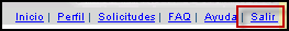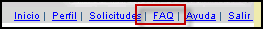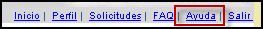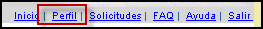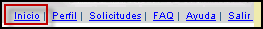 La mayoría de las páginas del Sistema ofrecen un menú superior en el cual aparecen las opciones para trabajar con el Perfil y con las solicitudes, además de las opciones de Inicio, FAQ, Ayuda y Salir: