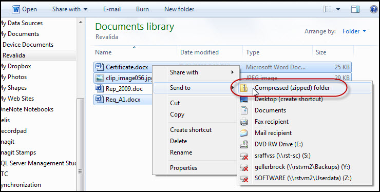 Abra el menú de contexto sobre uno de los archivos seleccionados (haciendo clic con el botón secundario del mouse) y escoja la opción "Send to > Compressed (zipped) folder":